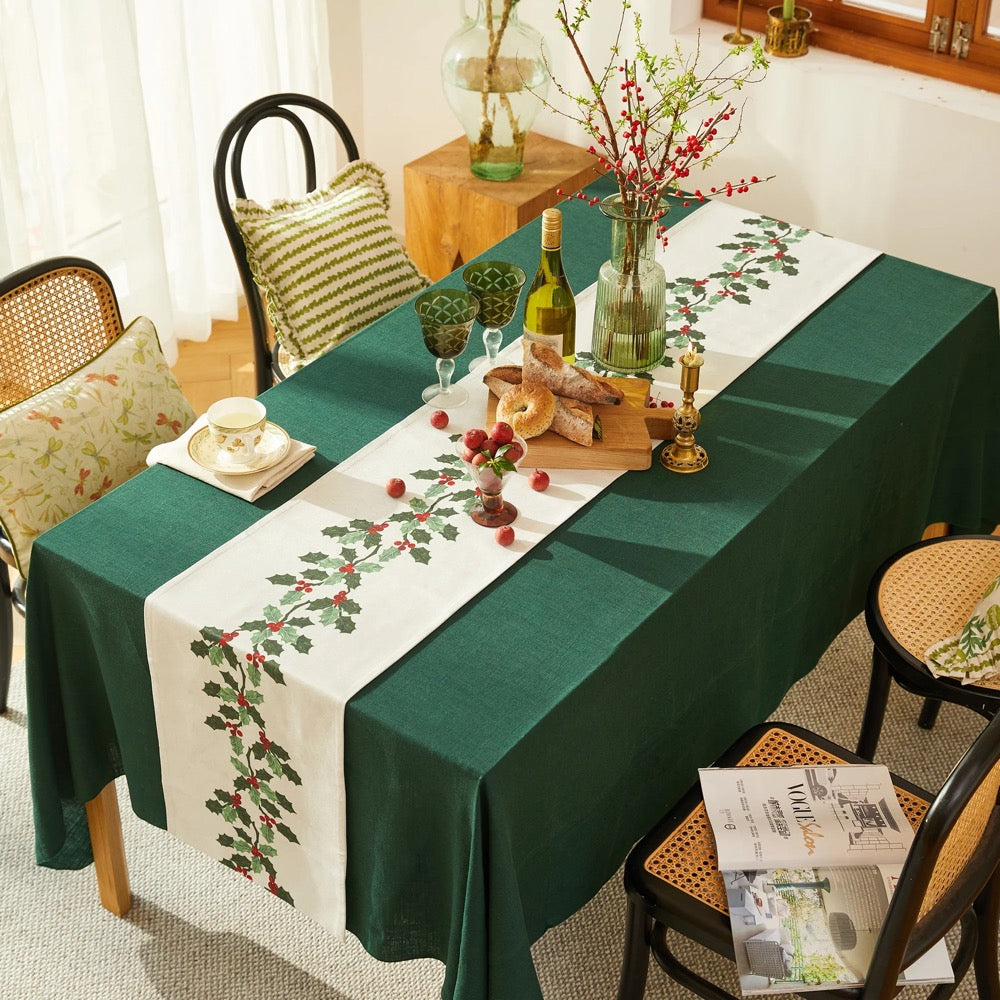 handcrafted table runner features hand-drawn holly, berries, and ribbon bows on a warm ivory ground with crisp red